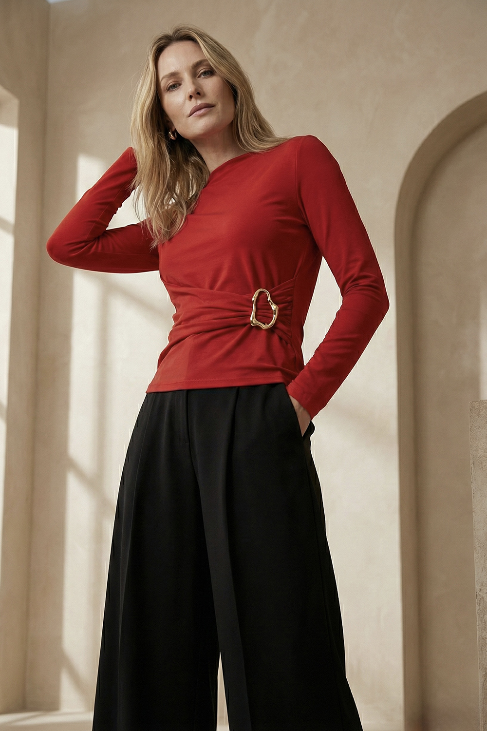 Приталенный лонгслив с цельнокроеной стойкой и асимметричным поясом с пряжкой — акцентная база для современного гардероба. Модель мягко подчёркивает фигуру, создавая аккуратный силуэт без стянутости и лишнего объёма. Лонгслив легко вписывается в повседневные и вечерние образы, добавляя ощущение собранности и стиля.